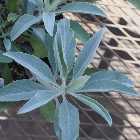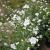 白花、シルバー葉、高さ1m。 春〜秋に開花。 春の開花後刈り込みを薦めます。 |